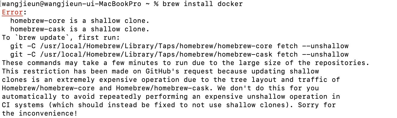 ๋์ปค ์ค์นํ๋ ค๊ณ brew install docker ํ๋๊น ๋ค์๊ณผ ๊ฐ์ ์ค๋ฅ ::