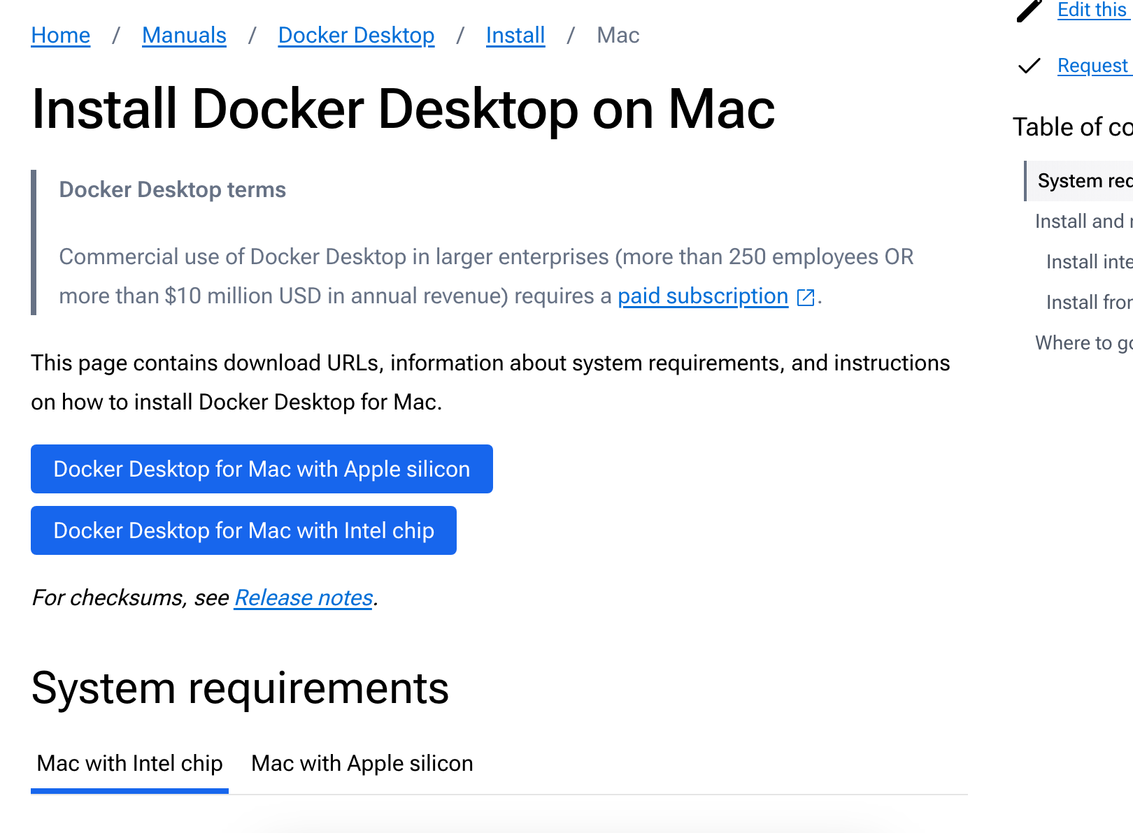 https://docs.docker.com/desktop/install/mac-install/ ์ฌ๊ธฐ์ ๊ฐ๋ฅํ๋ค.