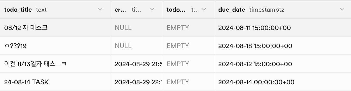 ๋ค์ ์ฌ์ง์ ๋ณด๋ฉด 08/12์ ํ์คํฌ์ due_date๋ก 08/11 15์๋ก ๋์ด ์๋ ๊ฒ์ ํ์ธํ ์ ์์ต๋๋ค.