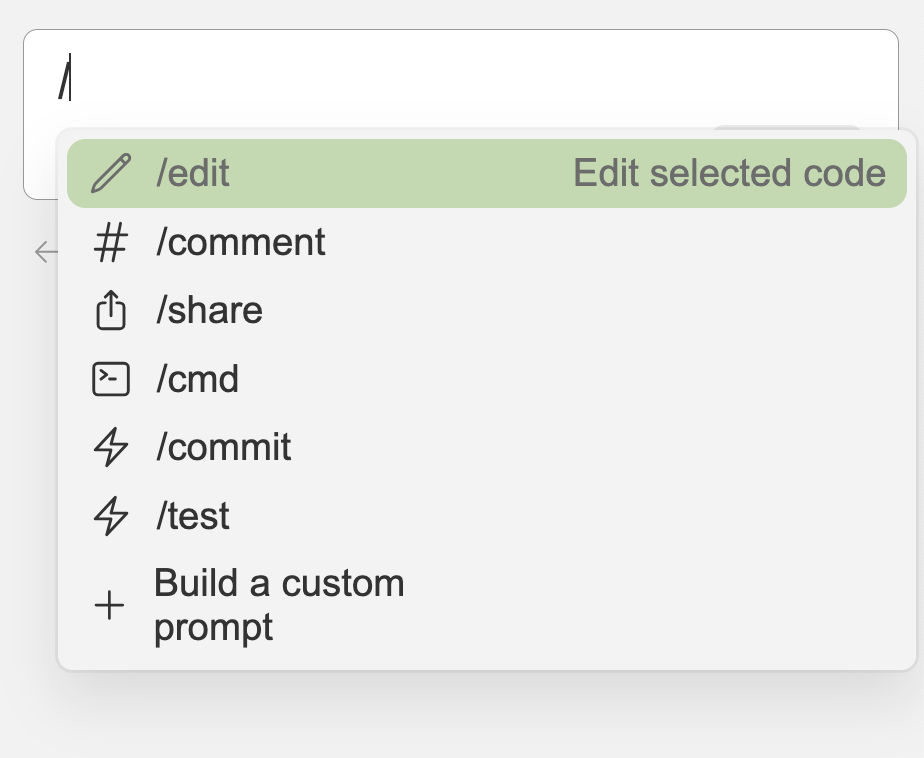 ์ฌ์ฉ์๊ฐ ์ง์ ํ๋กฌํํธ๋ฅผ ์์ฑํ ์๋ ์๋๋ฐ, ๋งจ ๋ฐ์ Build a custom prompt๋ฅผ ๋๋ฅด๋ฉด ์์ ํ๋ ๊ณณ์์ .prompt๋ผ๋ ํด๋๊ฐ ์์ฑ๋๋ค. ๊ทธ๋ฆฌ๊ณ ๊ทธ ํ๋กฌํํธ ํด๋์์ ์์ฑํ ํ์ผ์ ์ด๋ฆ์ ํ๋กฌํํธ๋ฅผ ์์ฑํ๋ ๋ฐ ์ฌ์ฉํ ์ฌ๋์ ๋ช ๋ น์ด์ ์ด๋ฆ์ด ๋๋ค.