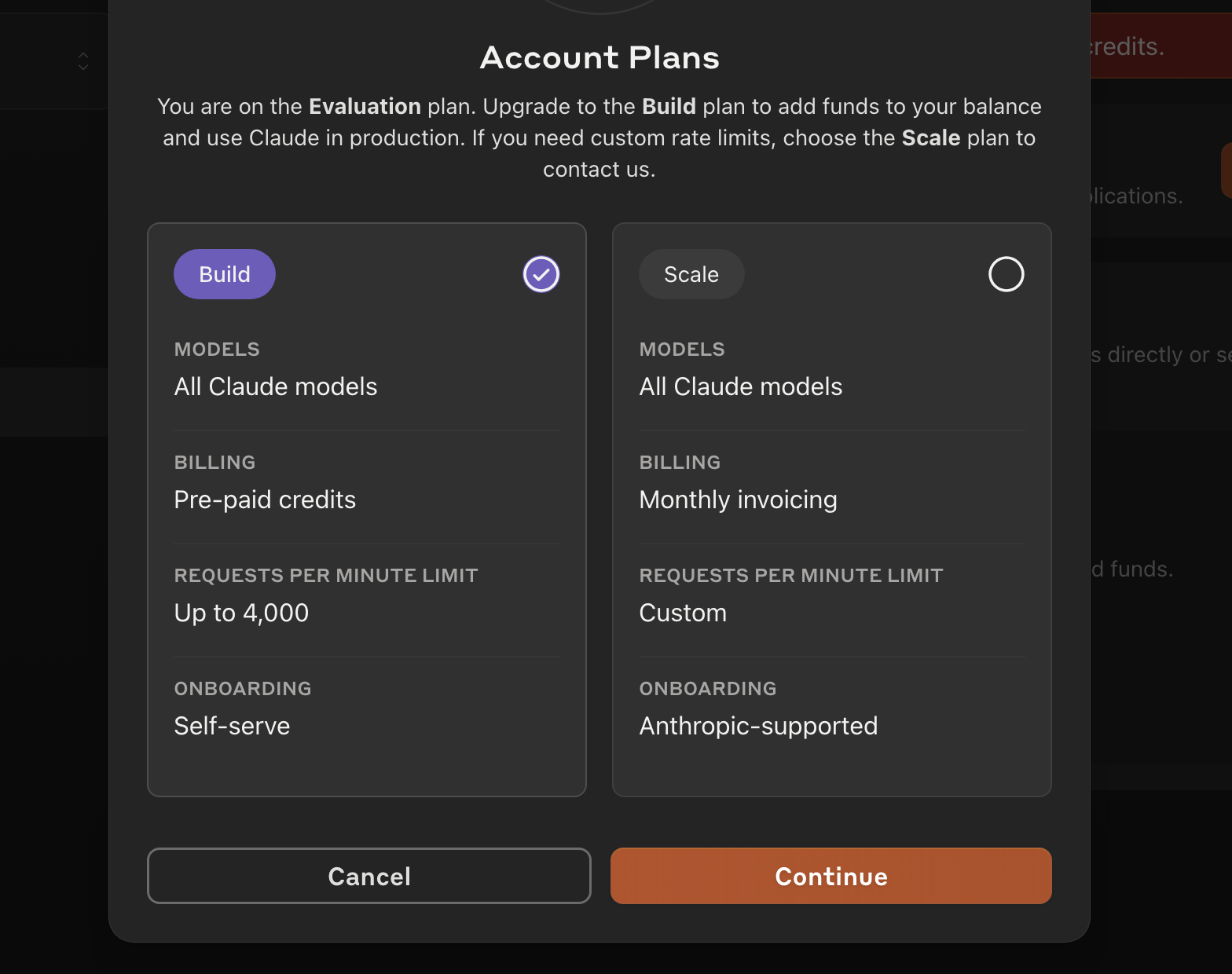 ์์ฒ๋ผ Build/Scale ๋ฐฉ์์ด ์๋ค๊ณ ๋จ๋๋ฐ Build๋ก ์งํํ๋ฉด OpenAI ์ฒ๋ผ ํฌ๋ ๋ง ์ฐจ๊ฐ ํ์์ด ๋๊ณ , Scale๋ก ์งํํ๋ ค๋ฉด "Contact sales to upgrade to Scale" ์ด๋ผ๊ณ ์์ ๋ถ๋ ์ปจํํ๋ผ๋ ๋ฉ์ธ์ง๊ฐ ๋์จ๋ค.