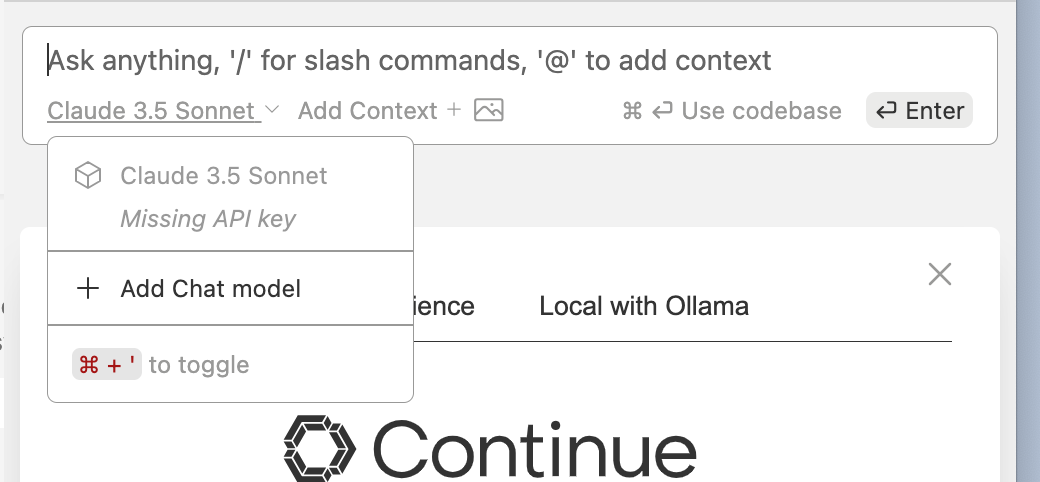 Continue ์ฐฝ์ vscode ๊ธฐ์ค cmd+L๋ก ์ด ์ ์๋ค.