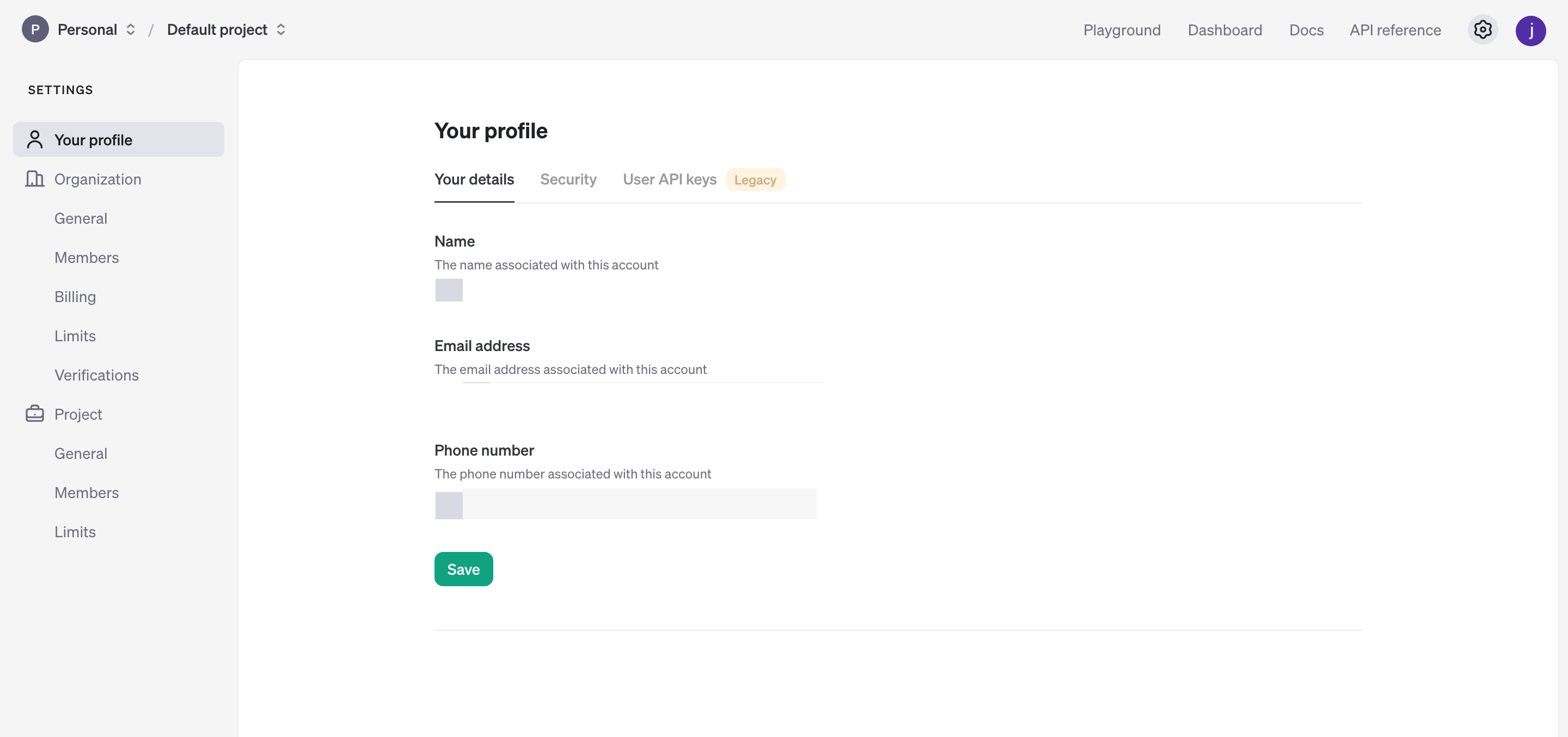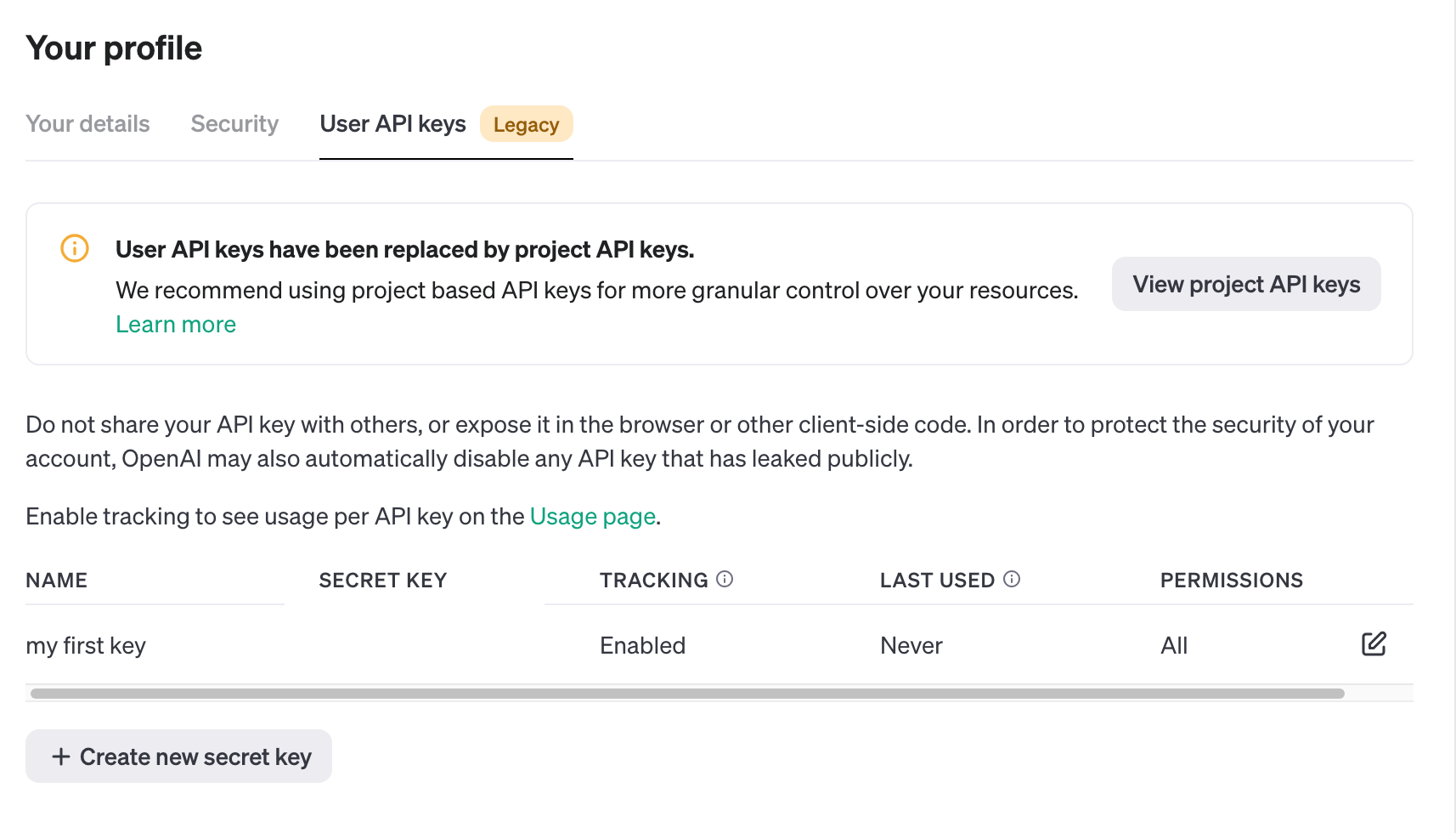 ํ๊ณ ๋ค์ Profile๋ก ๋์๊ฐ์, api key๋ฅผ ๋ฐ๊ธ๋ฐ์ผ๋ฉด ๋๋ค. project API key๋ก ๋ฐ๊ธ ๋ฐ์ผ๋ฉด ๋ฆฌ์์ค ๊ด๋ฆฌํ๊ธฐ ์ข๋ค๊ณ ํ์ง๋ง ๋ ๊ณต๋ถํ๋๋ฐ ์ฌ์ฉํ ๊ฑฐ๋๊น ๊ทธ๋๋ก ํต๊ณ ์~!