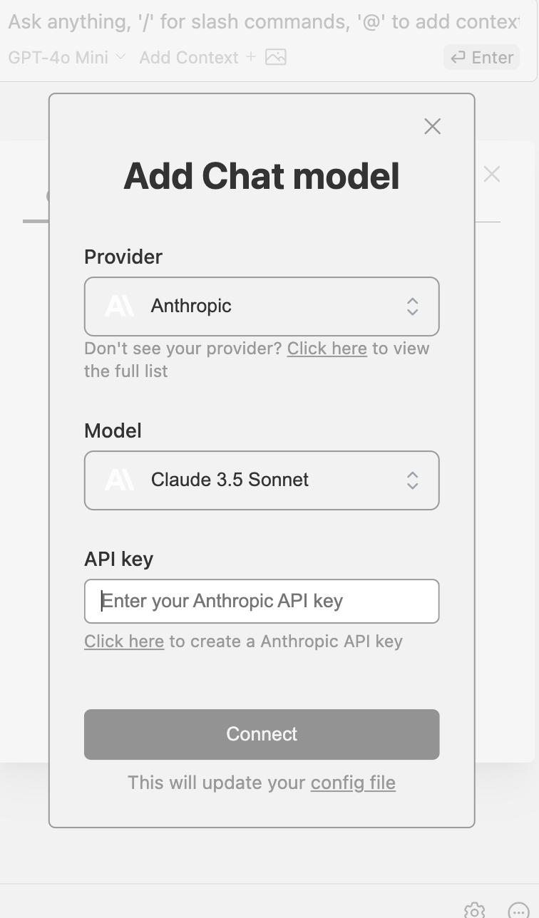Add ๋๋ฌ์ฃผ๋ฉด ๋ค์๊ณผ ๊ฐ์ ๋ชจ๋ฌ์ด ๋จ๋๋ฐ ์ฌ๊ธฐ์ Provider๋ ์ ํํ ๋ชจ๋ธ์ ๊ณจ๋ผ์ฃผ๊ณ api key ๋ฃ์ด์ฃผ๋ฉด ๋์ด๋ค.