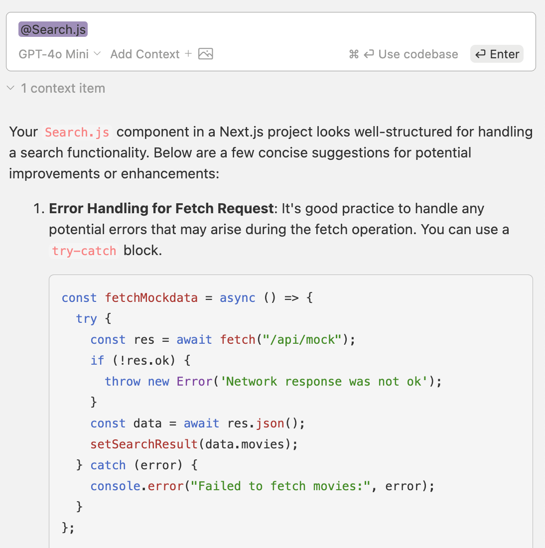 Chatgpt๋ Claude์ ๊ฐ์ ์ง๋ฌธํ๋ฉด vscode ์์์ ๋ฒ์ด๋ ์๋ค๊ฐ๋คํด์ผํ๋ ๊ฒ๋ ๋ฒ๊ฑฐ๋กญ๊ณ , ์ฝ๋ ์์ ๋ฌธ์ ๋ฅผ ๋ช ํํ ์ง์ด๋ด์ง ๋ชปํ๋ค๋ ๋๋์ ์ข ์ข ๋ฐ์๋๋ฐ ์ด๋ฐ ์์ผ๋ก ์ปดํฌ๋ํธ ํ๋์ ์ฝ๋๋ฅผ ํต์งธ๋ก ๋ถ์ํ๊ณ ์ ์ํด์ฃผ๋ ๊ฒ ์ข์ ๋๋์ ๋ฐ์๋ค.